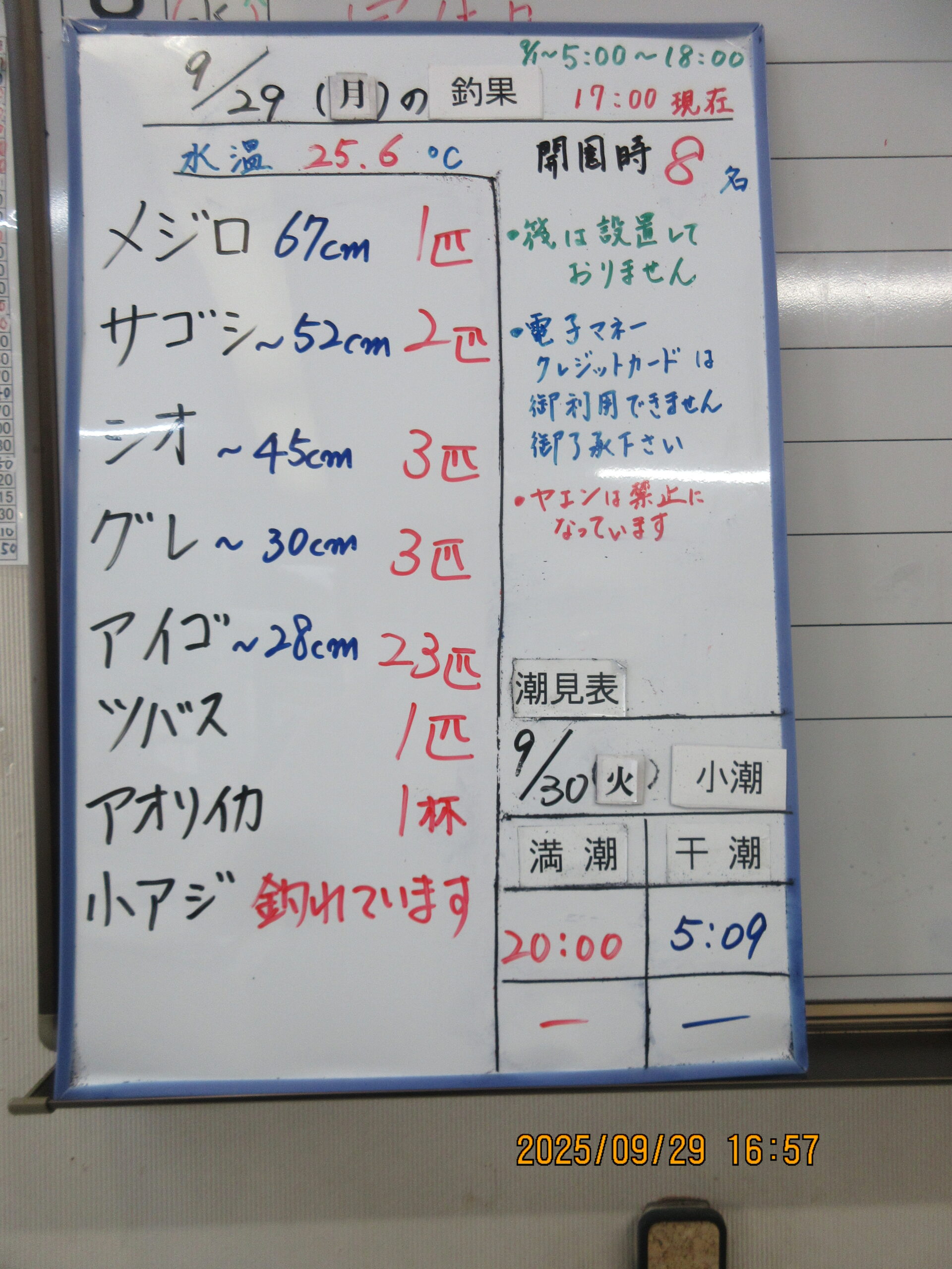 絞り込み結果 2025.09.29 魚種: 2025.09.29 天候:雨のちくもり 気温:25.6℃ 2025.09.29(月)本日の釣果 魚種: サイズ:cm 匹数:エサ: 昼から雨がやみ、時々日も差しています。少し波風あります。今日はメジロやシオが姿を見せてくれました。アイゴはすごく釣れています。 2025.09.29 魚種:メジロ 2025.09.29 天候:雨のちくもり 気温:25.6℃ 2025.09.29(月)遠藤様 魚種:メジロ サイズ:67cmcm 匹数:1エサ:アジ呑ませ 2025.09.29 魚種:シオ 2025.09.29 天候:雨のちくもり 気温:25.6℃ 2025.09.29(月)高山様 魚種:シオ サイズ:44cmcm 匹数:1エサ:ウリボウ呑ませ 2025.09.29 魚種: 2025.09.29 天候:雨のちくもり 気温:25.6℃ 2025.09.29(月) 魚種: サイズ:cm 匹数:エサ: 2025.09.29(月) 25,6℃ 開園8名 開園時間 5:00~18:00 お弁当は毎週水曜日、木曜日休ませて頂きます。 筏は当面、設置する予定はありません。ヤエン釣りは禁止になっております。 発熱,咳などの風邪症状などの体調がすぐれない方は、当施設のご利用お控えください 電子マネー、クレジットカードは御利用できません。ご了承下さい。