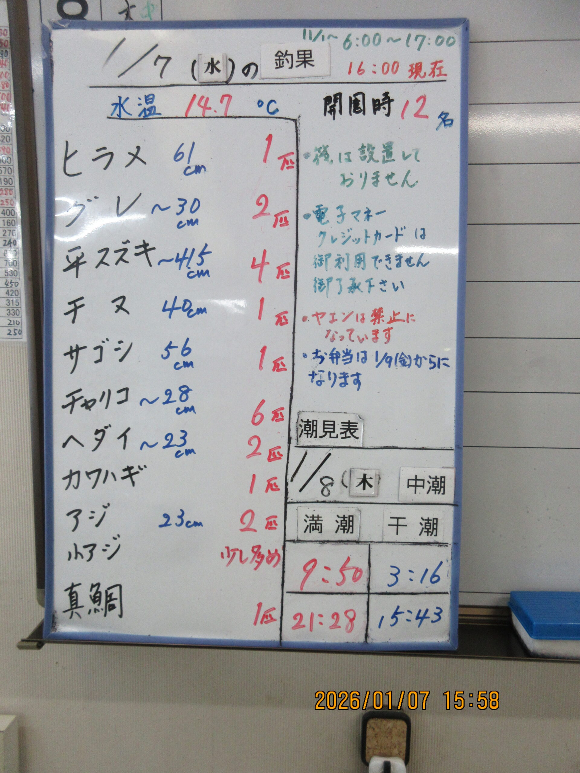 絞り込み結果 2026.01.07 魚種:真鯛 2026.01.07 天候:晴れ 水温:14.7℃潮:中潮 2026.01.07(水)川崎君 魚種:真鯛 サイズ:51.5cm 匹数:1エサ:オキアミ 2026.01.07 魚種:サゴシ 2026.01.07 天候:晴れ 水温:14.7℃潮:中潮 2026.01.07(水)川崎君 魚種:サゴシ サイズ:56cm 匹数:1エサ:ルアー 2026.01.07 魚種:ヒラメ 2026.01.07 天候:晴れ 水温:14.7℃潮:中潮 2026.01.07(水)栗山様 魚種:ヒラメ サイズ:61cm 匹数:1エサ:アジ呑ませ 2026.01.07 魚種: 2026.01.07 天候:晴れ 水温:14.7℃潮:中潮 2026.01.07(水)本日の釣果 魚種: サイズ: 匹数:エサ: 風波もなく穏やかで、こんな日は釣果も控え目と伺いますが、型の良い真鯛やヒラメ、ヒラスズキ等釣れて明日にも期待したいです。本日も有難うございます。 2026.01.07 魚種:ヒラスズキ,グレ 2026.01.07 天候:晴れ 水温:14.7℃潮:中潮 2026.01.07(水)中谷様 魚種:ヒラスズキ,グレ サイズ:平スズキ~41cm3匹.グレ30cm 匹数:4匹エサ:シラサ