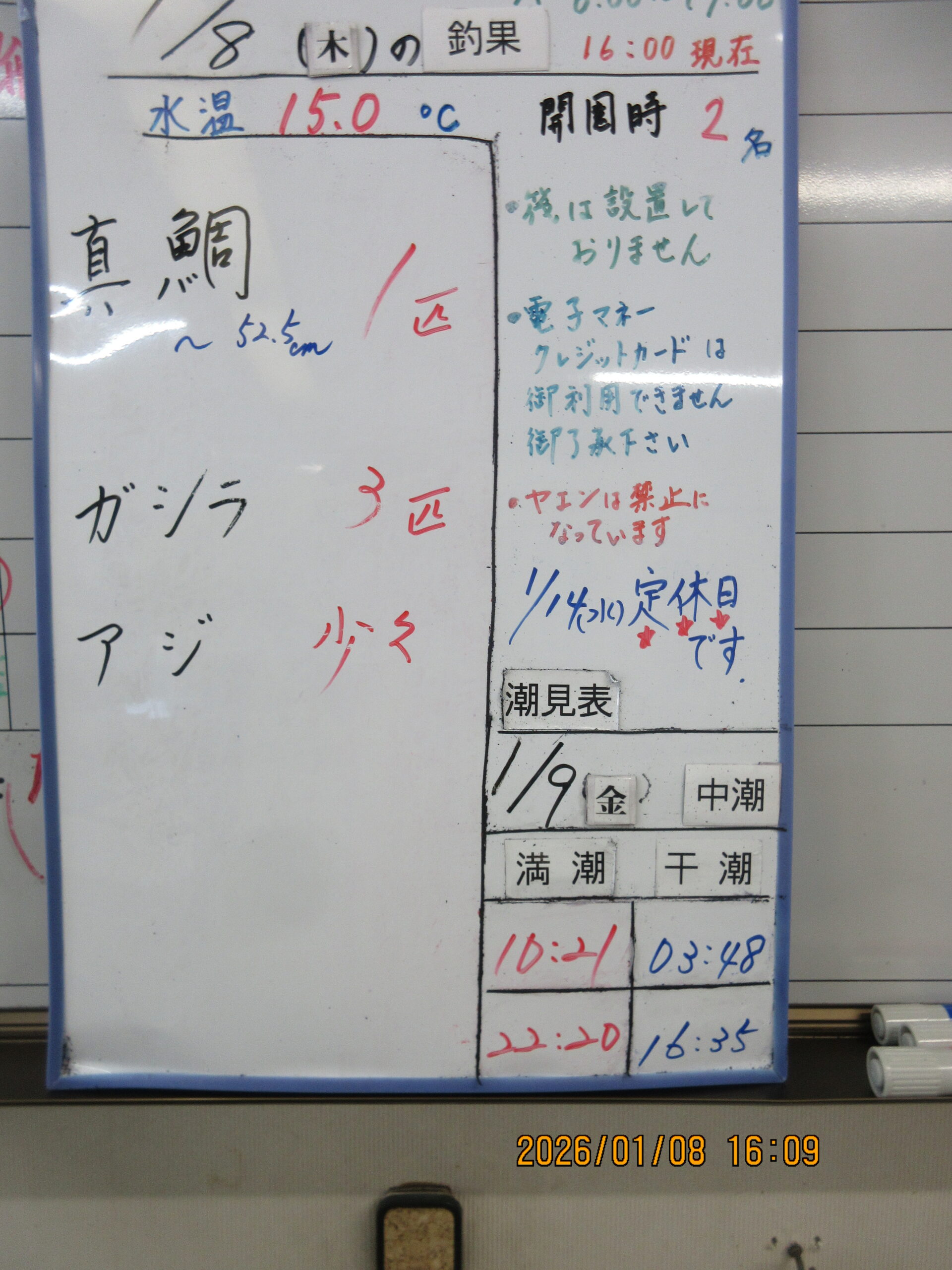 絞り込み結果 2026.01.08 魚種: 2026.01.08 天候:くもり 水温:15.0℃潮:中潮 2026.01.08(木)本日の釣果 魚種: サイズ: 匹数:エサ: 白波のある中真鯛の52.5cm釣って頂きました。お陰で釣果を乗せることが出来有難うございます。明日も続いて釣れますように宜しくお願いします。