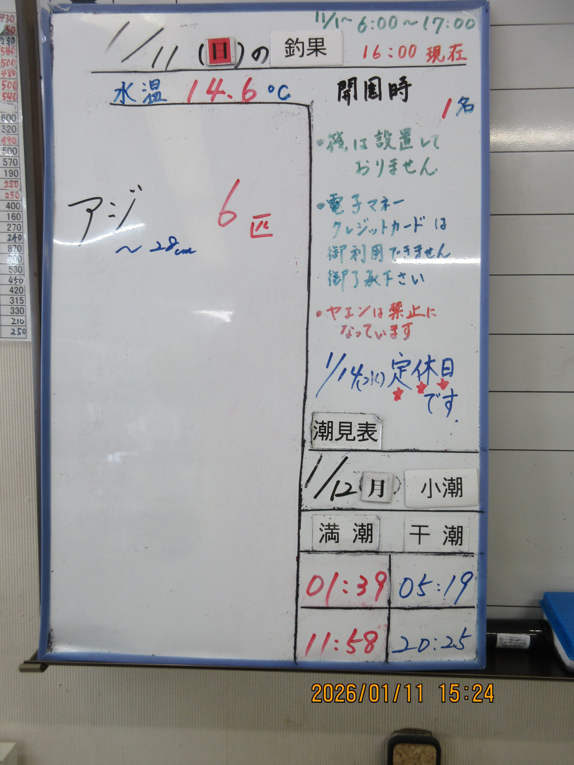 絞り込み結果 2026.01.11 魚種: 2026.01.11 2026.01.11(日)本日の釣果 魚種: サイズ: 匹数:エサ: この冬一番の強風と寒気で釣りにならないような天気です。それでもお二人の方が釣ってくれアジをあげてくれました。昨日せっかくアジが回ってきてくれたのにこんな天気になって残念です。明日風はマシになると思いますが、アジがいることを願っています。