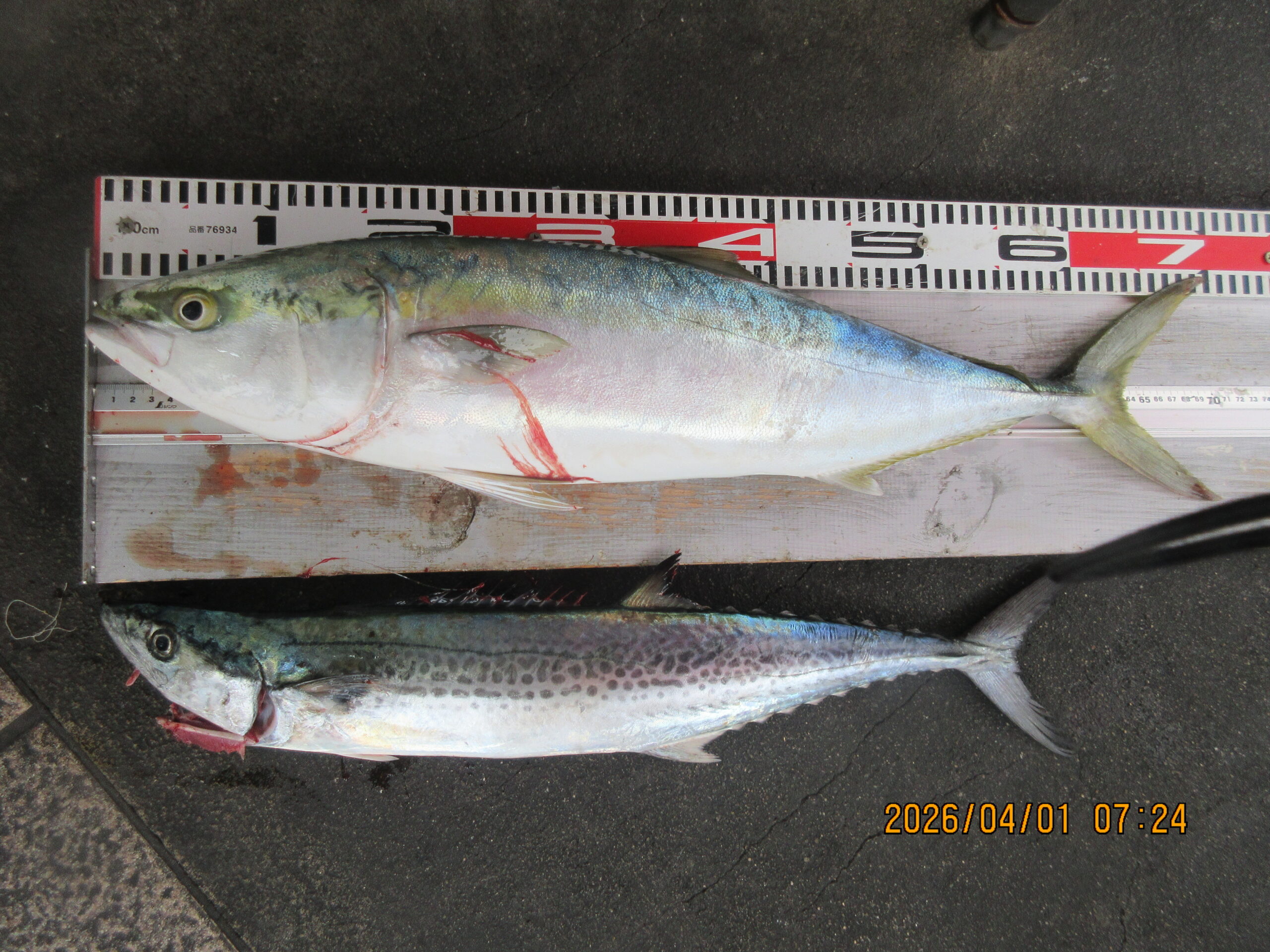 絞り込み結果 2026.04.01 魚種:メジロ,サゴシ 2026.04.01 天候:くもりのち雨 水温:19.2℃潮:大潮 2026.04.01(水) 魚種:メジロ,サゴシ サイズ:サゴシ60cm.メジロ71cm 匹数:2匹エサ:ルアー