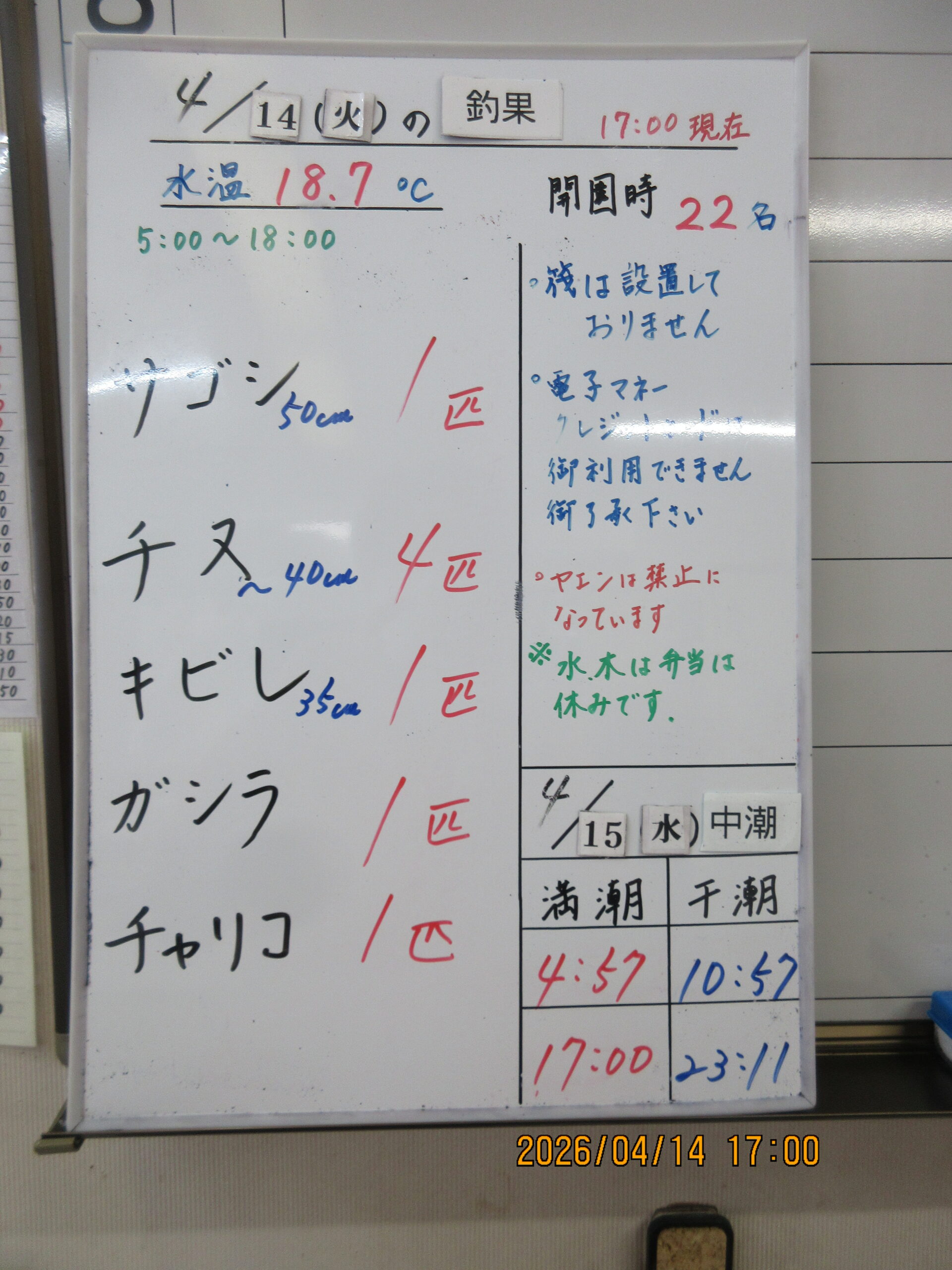 絞り込み結果 2026.04.14 魚種: 2026.04.14 天候:晴れ 水温:18.7℃潮:中潮 2026.04.14(火)本日の釣果 魚種: サイズ: 匹数:エサ: 日差しがあった午前は暑く、あまり潮の動きがなかったそうです。午後からは風が出てきて、一気にひんやりしてきました。イワシや小アジはいるけれど群れが小さいそうです。午前に型の良いチヌやキビレが釣れていましたが、アオモノでのいつもの盛り上がりは厳しいようです。 2026.04.14 魚種:キビレ,チヌ 2026.04.14 天候:晴れ 水温:18.7℃潮:中潮 2026.04.14(火)佐藤様 魚種:キビレ,チヌ サイズ:~35cm 匹数:1匹 3匹エサ:オキアミ 紀州釣り
